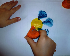 ■ Разведите краску с водой на палитре, окунайте штамп и ставьте отпечатки. Некоторым детям нравится смазывать штамп краской с помощью кисточки.